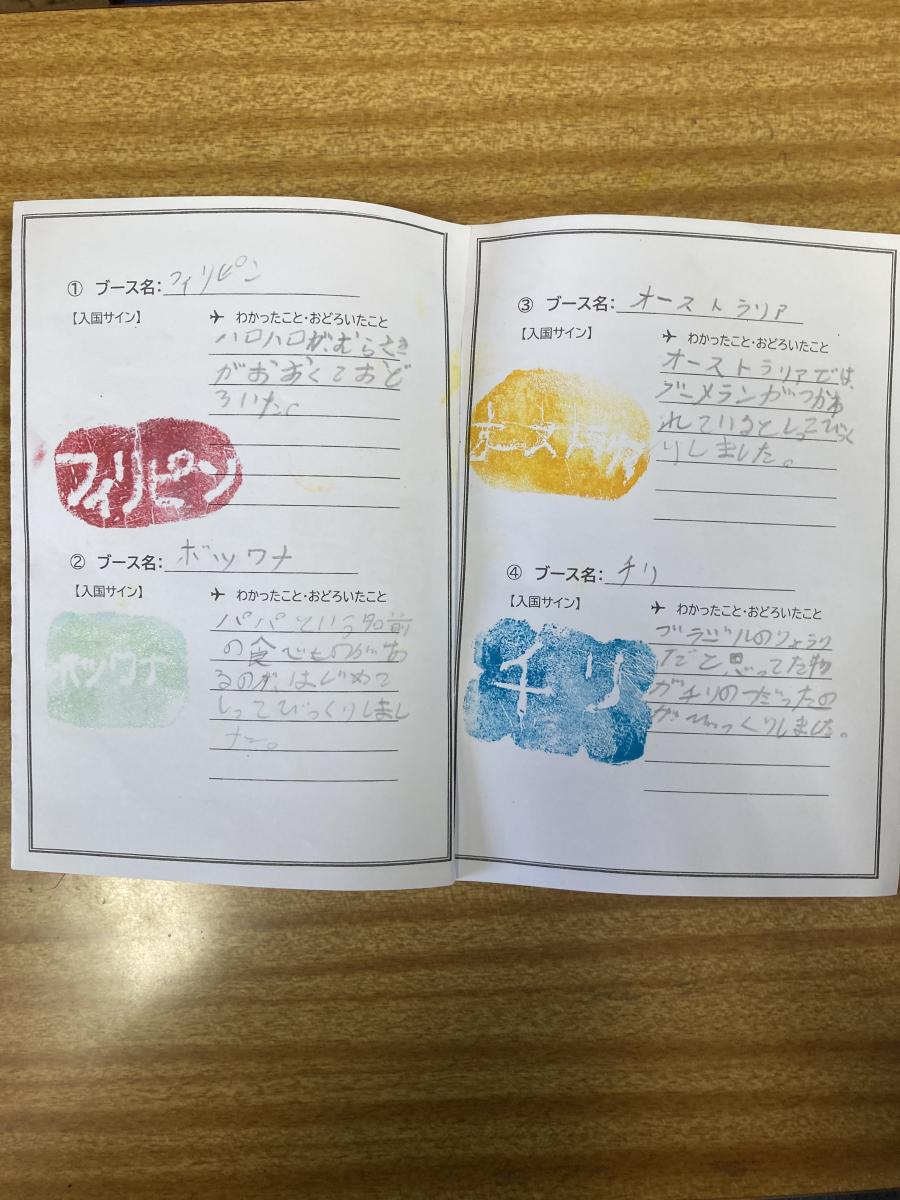 4年生がつくばスタイル科の学習で外国の事について調べたことを伝え合う活動としてミニ万博を開催しています。今回は1組と2組でした。一人ずつパスポートをもって発表を聞きに行き、最後に各国のスタンプを押してもらうという凝りようでした。