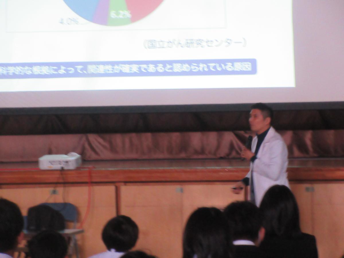 この講演会は、健康教育の一環として「がん」についての正しい理解などを通して、自他の健康と命の大切さについて学び主体的に考えられるようになるために実施するものです。生徒たちは。がんになるリスクや日常の健康な生活を送るために大切なことなどを学ぶことができました。