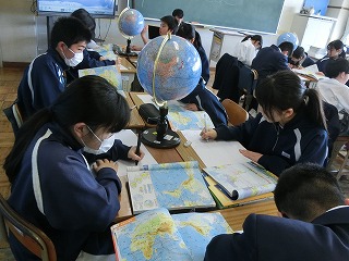 生徒たちは、地球儀や世界地図を見ながら、オリジナルの世界地図を描き上げていきました。