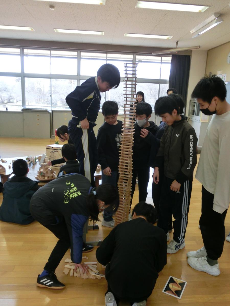 今日は高学年を対象に木工玩具で遊ぶ時間がありました。前回の低学年同様、業間や昼休みには多くの児童でにぎわいました。高学年になると自分たちでルールを決めて遊んだり、みんなで協力して作品を仕上げたりと、低学年とは一味違った遊び方をしている児童が多く見られました。また、休み時間ぎりぎりまで遊ぶ姿から、まだまだ遊び足りない様子がうかがえました。